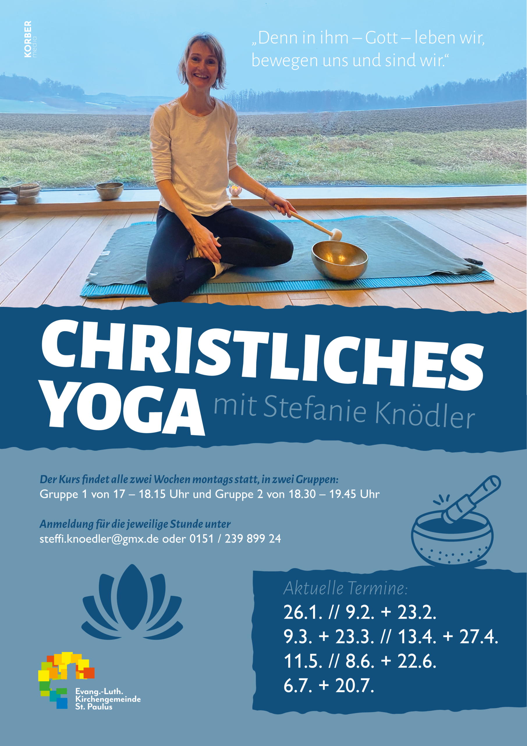 Gemäß dem Satz aus der Apostelgeschichte: „Denn in ihm -Gott- leben wir, bewegen uns und sind wir“ möchte ich mit den Yogastunden einen Raum für mehr Achtsamkeit in die Einheit Körper, Geist und Seele ermöglichen.